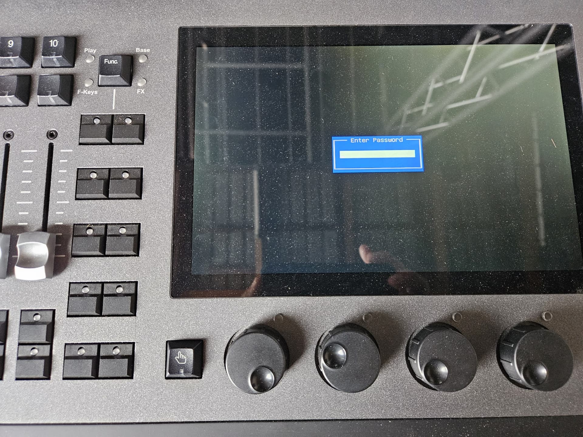 same problem here. I installed the newest update and dylos content on my nx1. After saving the showfile, it shut down itself, and is now asking for a password on startup. Please help, thanks.