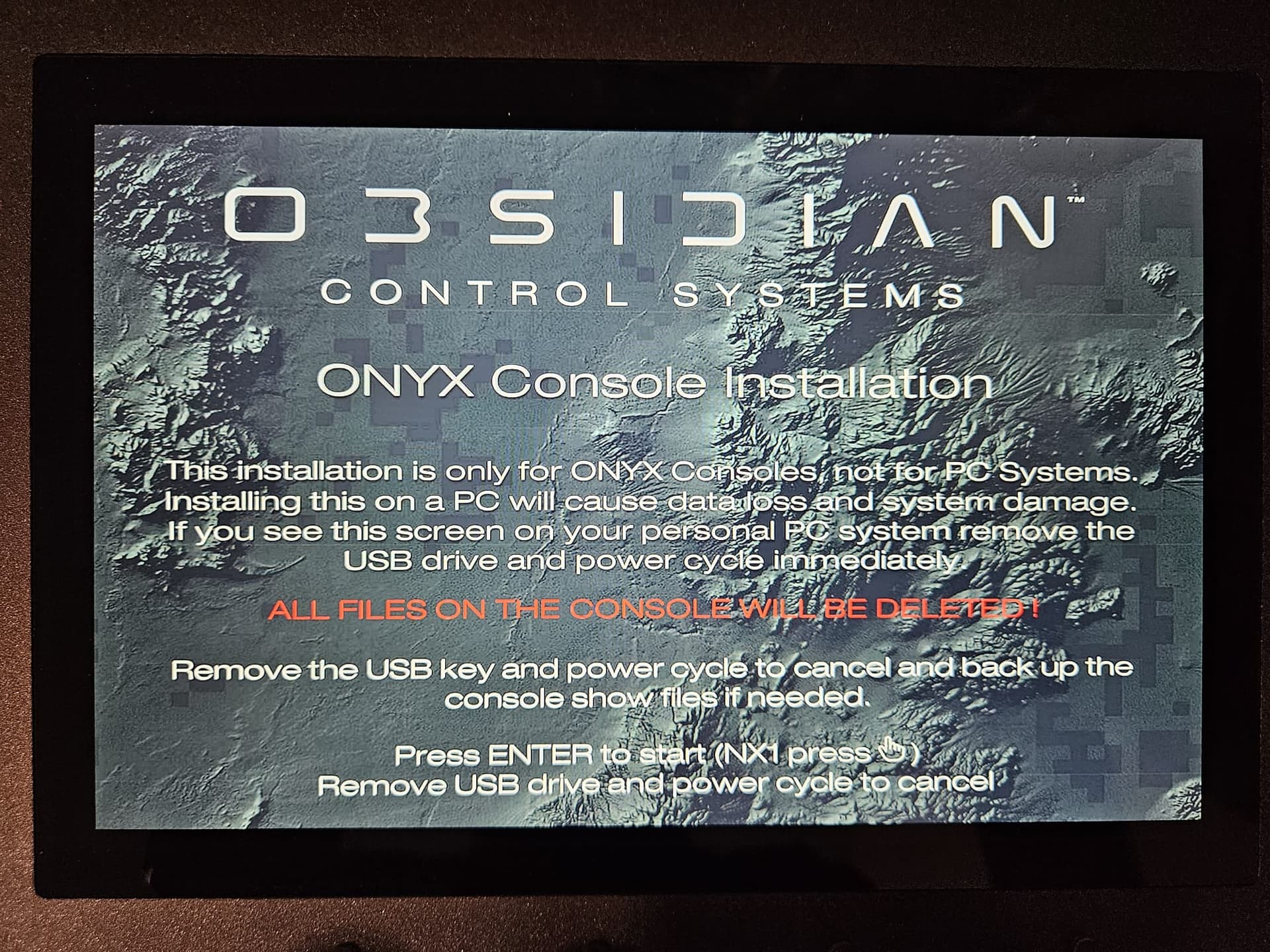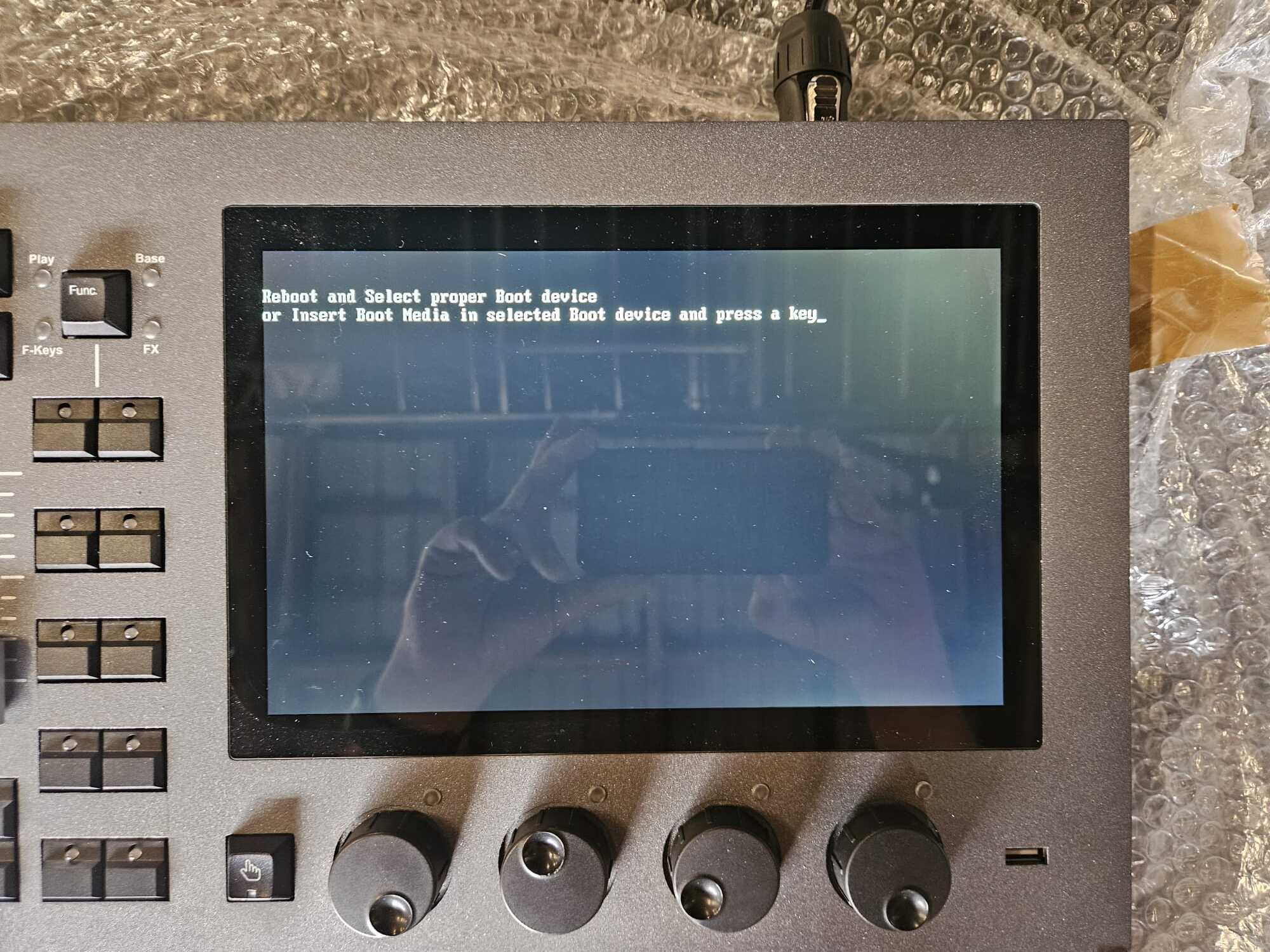 I connected my NX1 to a show on my laptop via X-Net. Everything worked fine, except for DyLos. DyLos kept crashing; some of the lights would turn off alternately. When I disconnected the NX1 from the show, DyLos ran smoothly. Since I hadn’t installed the DyLos content on my NX1 yet, I thought that might be the cause. So I started installing the DyLos content, and unfortunately, the same error occurred again as last time. The NX1 shuts itself down during installation, restarts, and now I get all the error messages from last time: